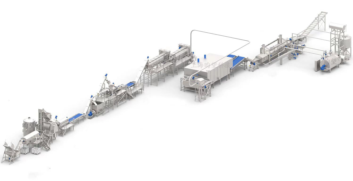 速凍薯條生產線的工藝流程如下:提升機-清洗脫皮機-挑揀線-提升機-切條機-漂洗機-漂燙機-冷卻線-風干線-振動篩-油炸線-脫油線-振動篩選機-挑揀線-速凍線-包裝機。